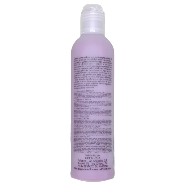 Formulato con materie prime esclusivamente di origine naturale di natura anionica modulabili nella loro azione, laurileteri e solfosuccinati da alcoli grassi naturali dotati di affinità con i capelli e di potere ammorbidente. Questa associazione permette una detersione rispettosa del mantello idrolipidico naturale e quindi non depauperante soprattutto a lungo termine. Questo è un prodotto trattante che permette di lasciare un film protettivo lucido per l'azione delle ammidi e delle proteine di origine naturale.